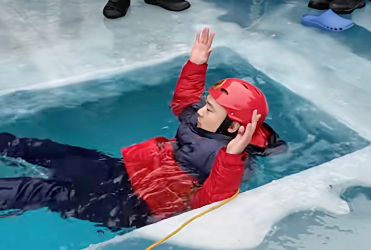 实验中,消防员身着羽绒服、拴好安全绳,亲身跳入冰水进行测试。落水初期,消防员确实可以漂浮在水面,但随着衣物持续进水,重量也不断增加。