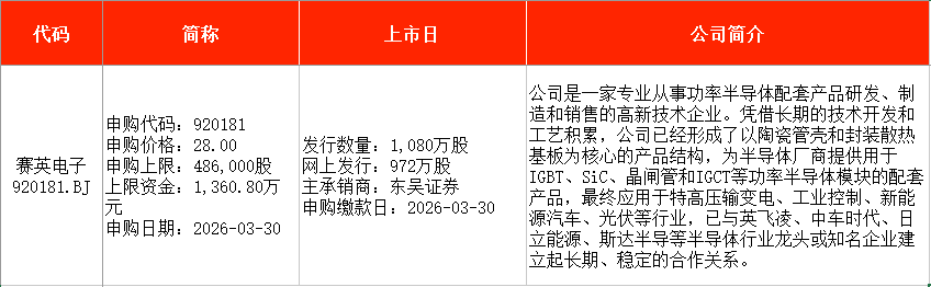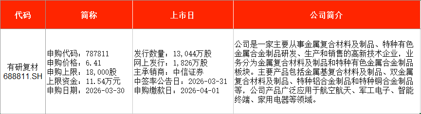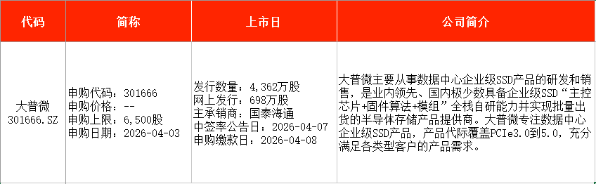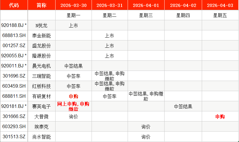从时间表看,有研复材(688811)、赛英电子(920181)在本周一(3月30日)申购,大普微(301666)则将在本周五(4月3日)申购。