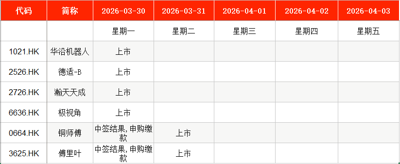 港股方面,Wind数据显示,本周(3月30日至4月3日)暂无新股申购安排。