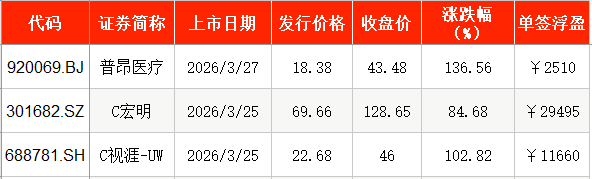 上周,共有3只新股上市。